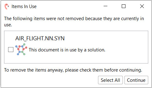 The rest of the dialogue continues as previously when deleting with usage check, letting the user select which documents to delete even when they are in use in the solution.