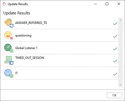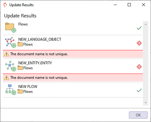 Once Teneo Studio has finished updating the documents, an Update Results window will be displayed. Simply click OK to continue.